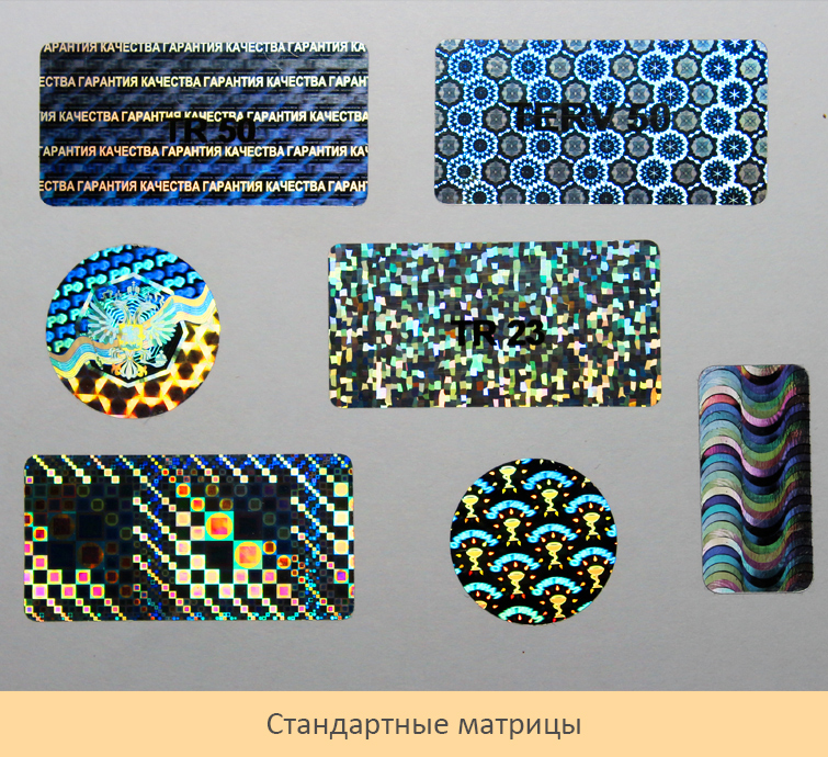 Начнем с голографических матриц. Матрица это тот самый «мастер» с голографическим рисунком, который используется при печати тиража голограмм. Матрицы бывают стандартные и индивидуальные.