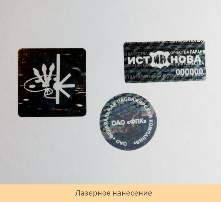 Лазерное нанесение (деметализация) - это персонализация при которой мощным лазерным излучением на стандартном фоне «выжигается» необходимый рисунок. Выжигается только алюминизированное покрытие голограммы и если голограмма делается на лавсановой основе, то в месте прожига будет прозрачность. В этом случае цвет рисунка будет определятся цветом того места на которое голограмма будет наклеена. Если в качестве подложки используется целлюлоза, то цвет нанесения будет «белым». Ограничения по минимальному элементу – до 0.2 мм.