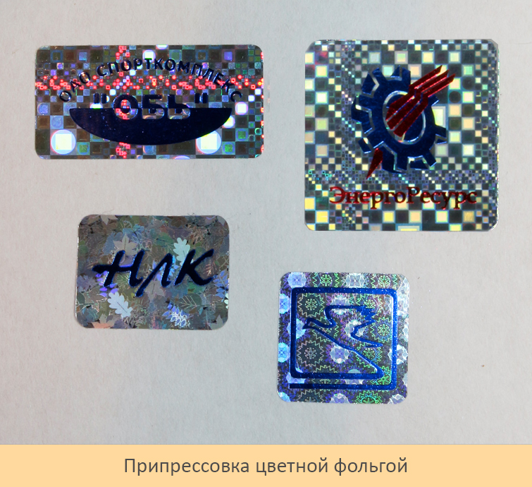 Припрессовка цветной фольгой это персонализация при которой на стандартный голографический фон с помощью прессовочных клише наносится рисунок специальной цветной фольгой. Возможен: красный, синий, темно-синий, зеленый, черный, «золотой» и «серебряный» цвет. Также, возможно нанесение двухцветных изображений (делается два клише). Визуально голограмма выглядит очень контрастной. Разрешение минимального элемента изображения, которое можно выполнить данным методом, около 0.8 мм.