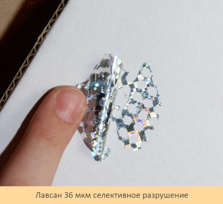 «Лавсан 36 мкм» – голографический материал с селективным типом разрушения. Достаточно «толстый» материал для удобного ручного и полуавтоматического нанесения на поверхность. При попытке отклеивания часть голограммы, в шахматном порядке, остается на отрываемой лавсановой основе, а часть остаётся на поверхности наклеивания. Это самый популярный материал для голограмм – подходит для большинства случаев. Применяется для маркировки, но плохо применим для контроля вскрытия.