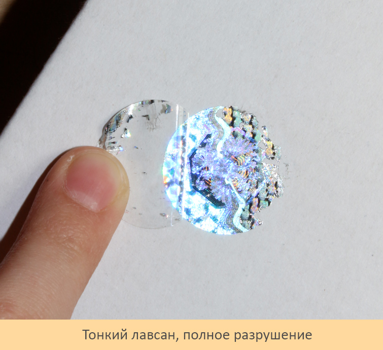 «Тонкий лавсан» - голографический материал с полным типом разрушения. Применяется в случае если нужно обеспечить максимальную защиту от переклеивания. При попытке снятия у голограммы отслаивается только верхний прозрачный слой. Голограмма тоньше обычной, что исключает автоматическое и полуавтоматическое нанесение на продукцию и немного усложняет процесс снятия голограмм с бумажной подложки (при ручном наклеивании). Тем не менее, голограммы на тонком лавсане применяются довольно часто.
